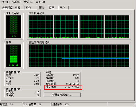 打开任务管理器,单击 性能,查看已提交内存与虚拟内存的比例。如下图所示,提交(MB)等于已提交虚拟内存/虚拟内存上限,即图中3790/4093,已经超过80%,而根据微软官方文档说明,系统内存不足,需要增加更多的内存。