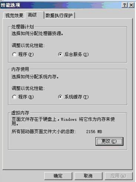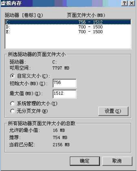 单击 更改(C) 即可设置虚拟内存。一般设置为物理内存的1.5或2倍大小就可以。