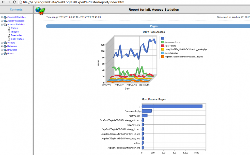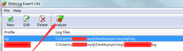 •开始分析:选中创建的项目名称,单击 Analyze 按钮开始分析。分析完成后,默认会在软件的 Report 文件夹下,生成分析日志。 示例:file:///C:/ProgramData/WebLog%20Expert%20Lite/Report/index.htm 。