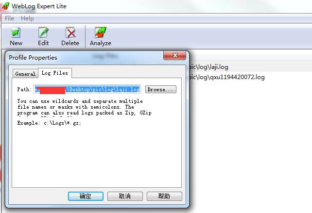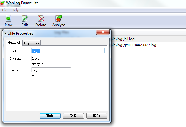 •新建分析:运行 WebLog Expert Lite,单击主界面的 【New】按钮 ,在弹出的窗口中,填写Profile,Domain,Index参数值(Profile 配置名称、Domain 域名、 Index 首页名称,可根据实际情况填写,也可填写任意字符)。